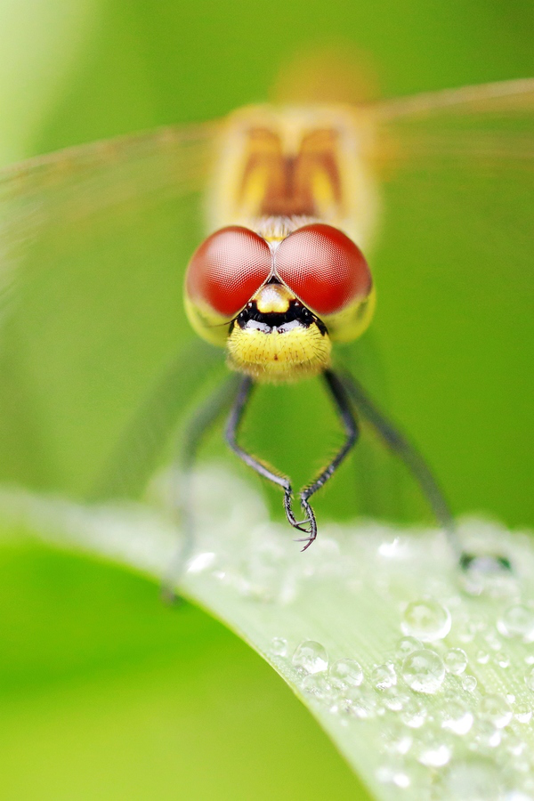 蜻蜓的复眼大部分是彼此相连或只有小距离的分开。豆娘的两眼有相当大距离的分开,形状如同哑铃一般。