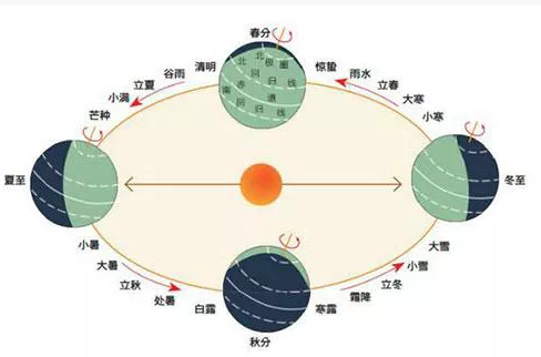 实际上,二十四节气是根据地球绕太阳公转的运动规律制定的,因此每一个节气都能真实地反映太阳与地球的相对位置关系。地球绕太阳运行的轨道,也就是太阳在天空中周年视运动的轨道称为黄道,分圆周为360度。二十四节气以春分点为起点,将黄道等分为24段,每段为15度,太阳每移行15度就表示到了一个节气。