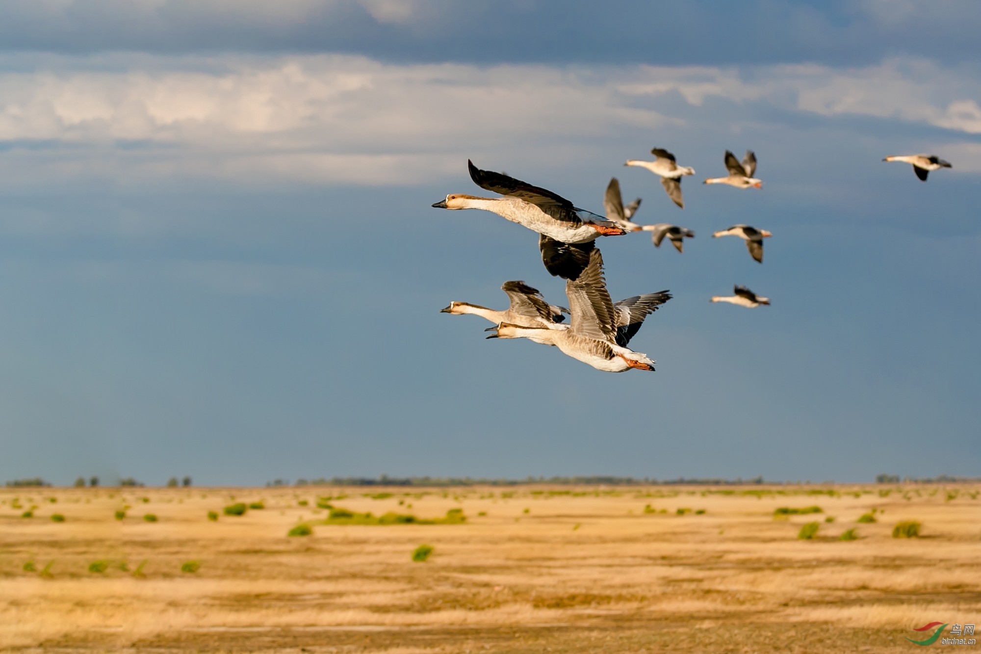 一候鸿雁来宾: 鸿雁排成一字或人字形的队列大举南迁。